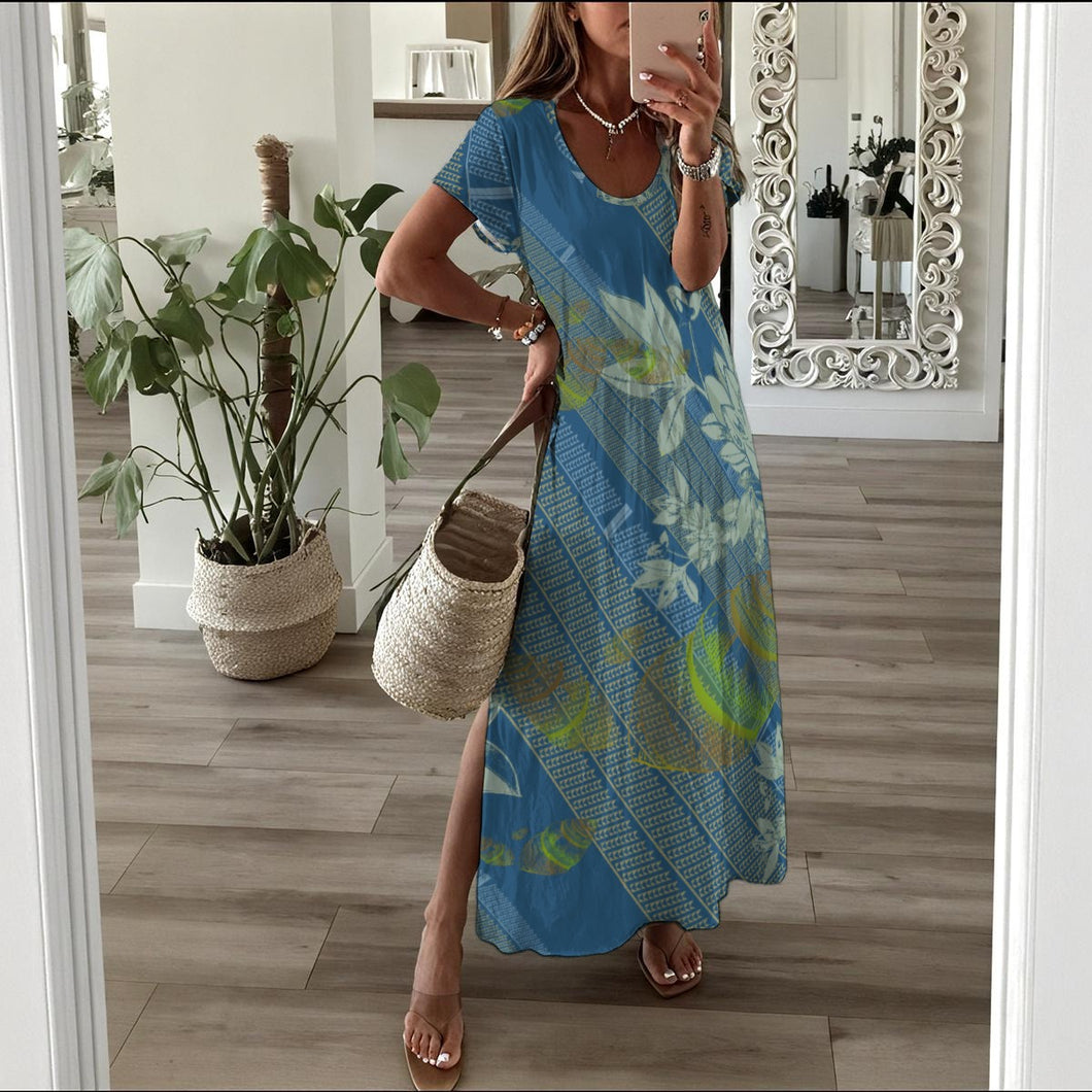 This loose-fitting maxi dress exudes sunny energy. Made from a cotton-like polyester fabric that feels as soft as cotton, it also has the durability and easy-care qualities of polyester. With a V-neck and short sleeves, this dress allows for breathability and freedom of movement. The straight silhouette offers a relaxed, feminine fit that flatters all body types.