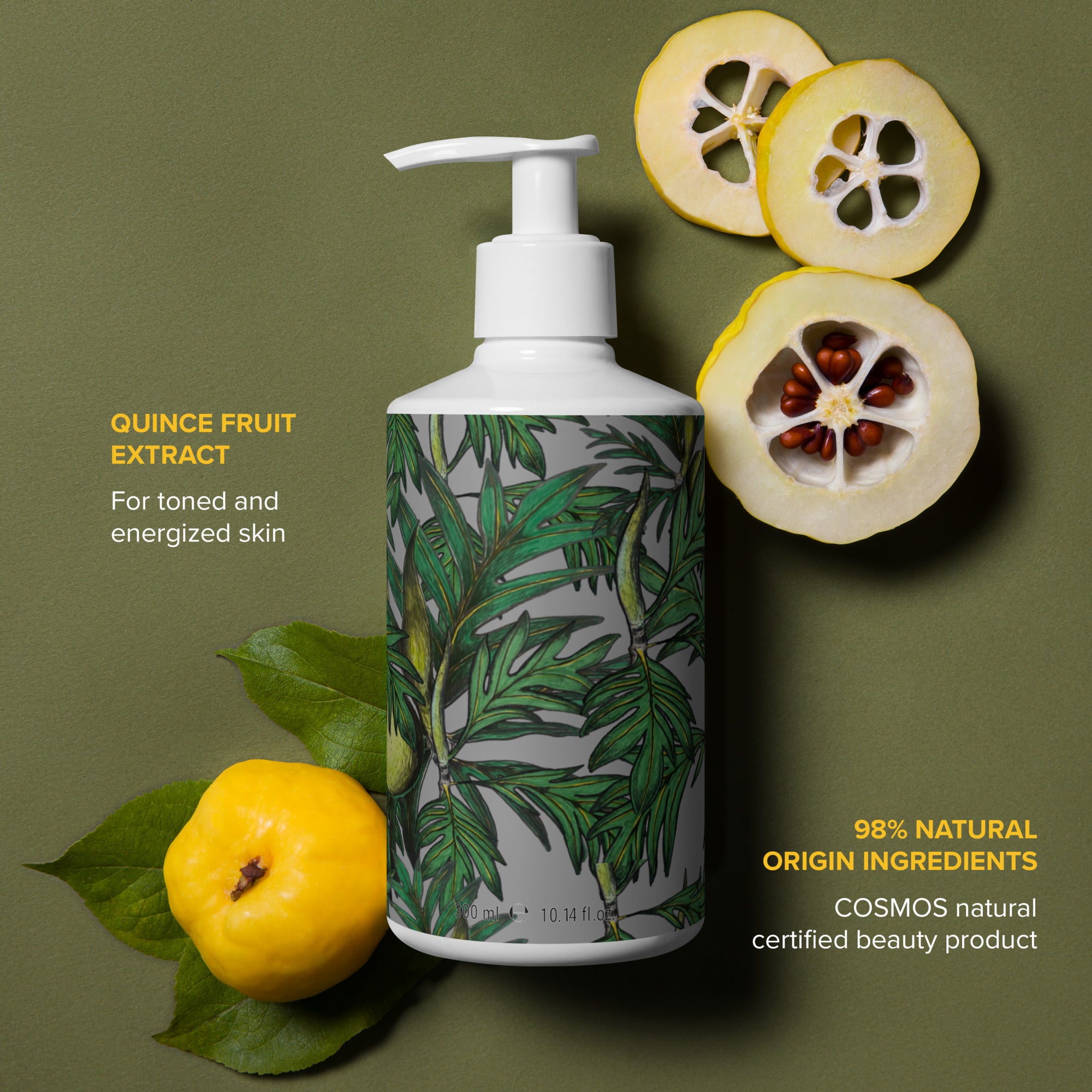 Ingredients: Aqua/Water, Sodium Coco-Sulfate, Sodium Cocoamphoacetate, Cocamidopropyl Betaine, Betaine, Coco-Glucoside, Citric Acid, Sodium Chloride, Parfum/Fragrance, Benzyl Alcohol, Pyrus Cydonia (Quince) Fruit Extract*, Sodium Benzoate, Potassium Sorbate, Linalool**, Citral**, Limonene**.